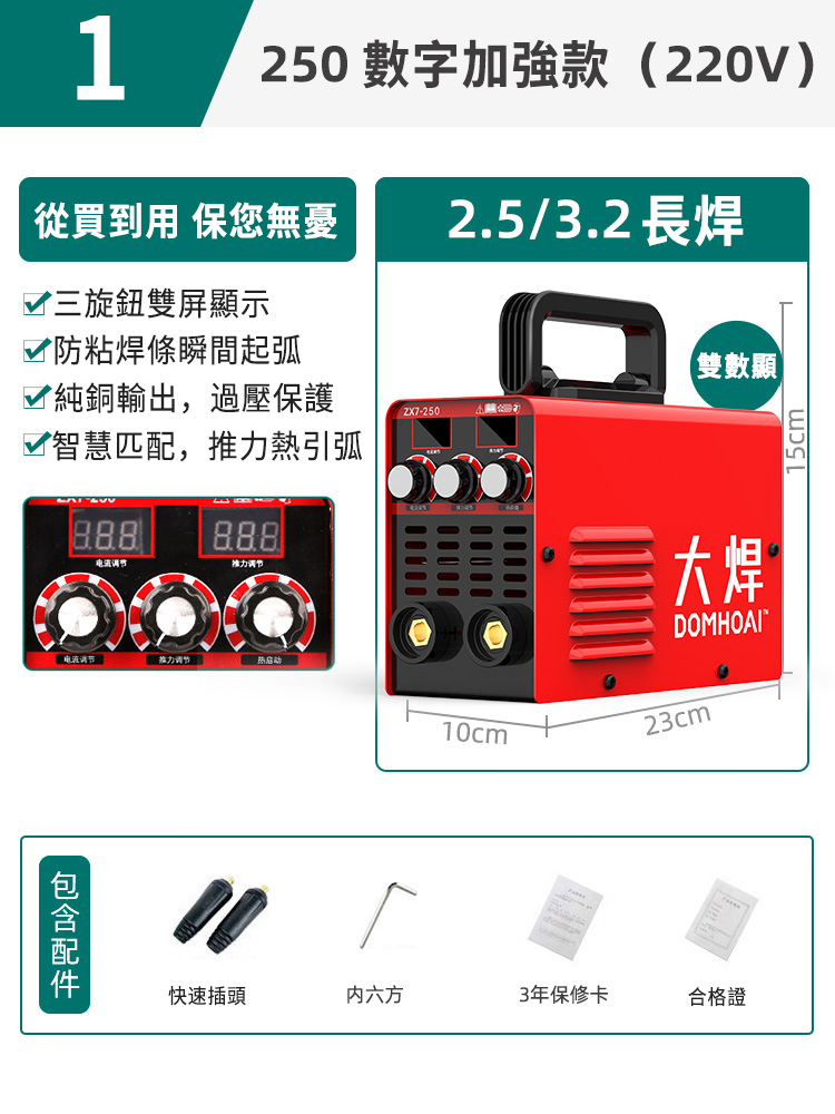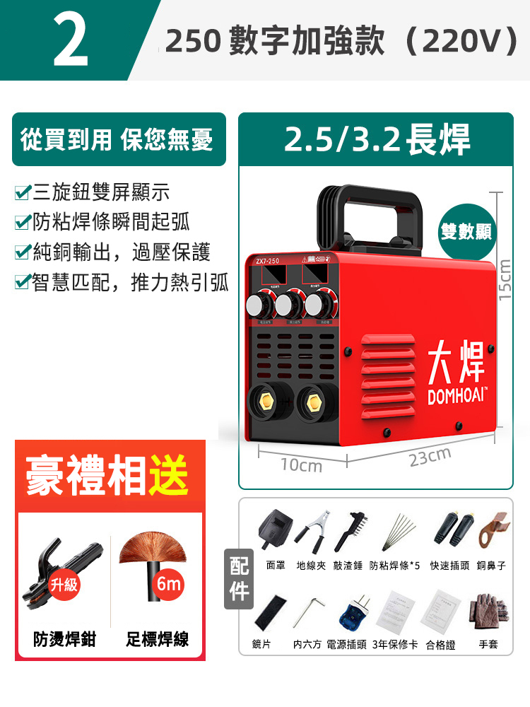 5分鐘前業內焊機領軍品牌【德國DOMHOAI】全新二代數字化電焊機,瞬間起弧,長焊4.0焊條 - 【250-220V】數字加強款+基礎套餐