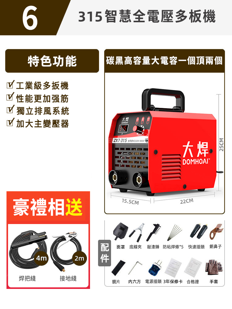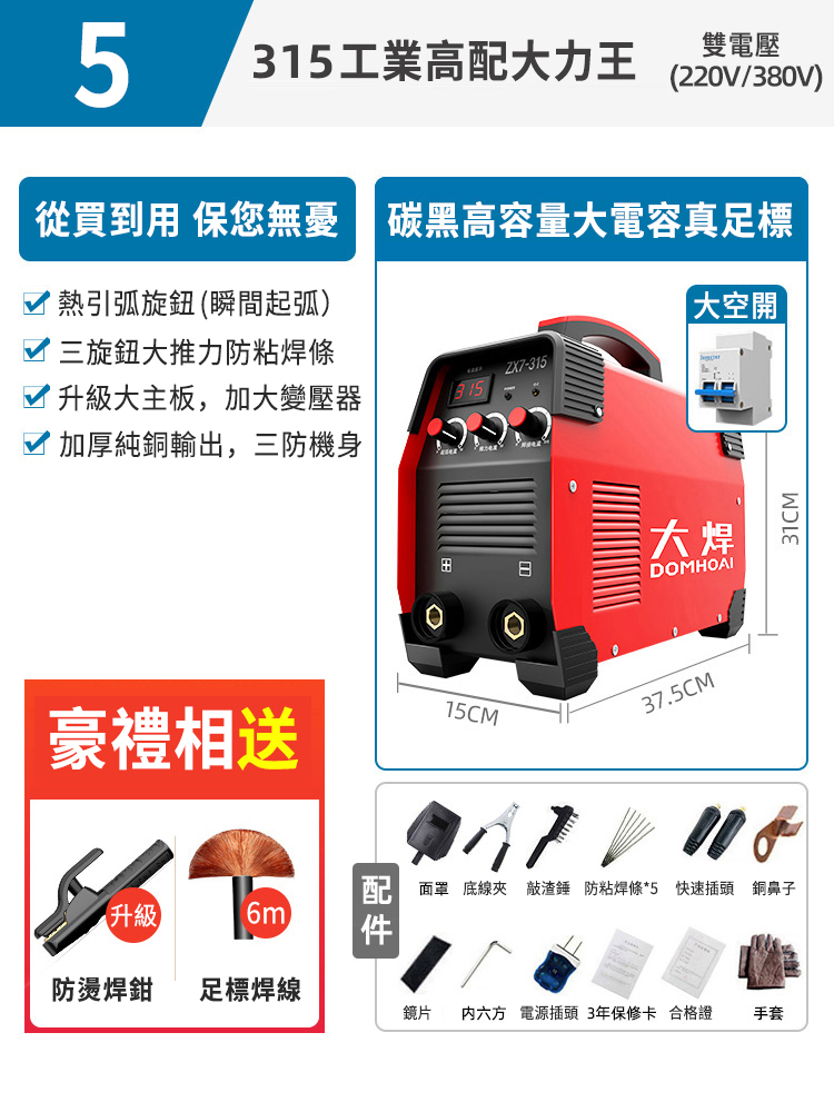 12分鐘前業內焊機領軍品牌【德國DOMHOAI】全新二代數字化電焊機,瞬間起弧,長焊4.0焊條 - 【315-220V/380V】智慧全電壓多板機+2米接地線+4米焊把線+大禮包