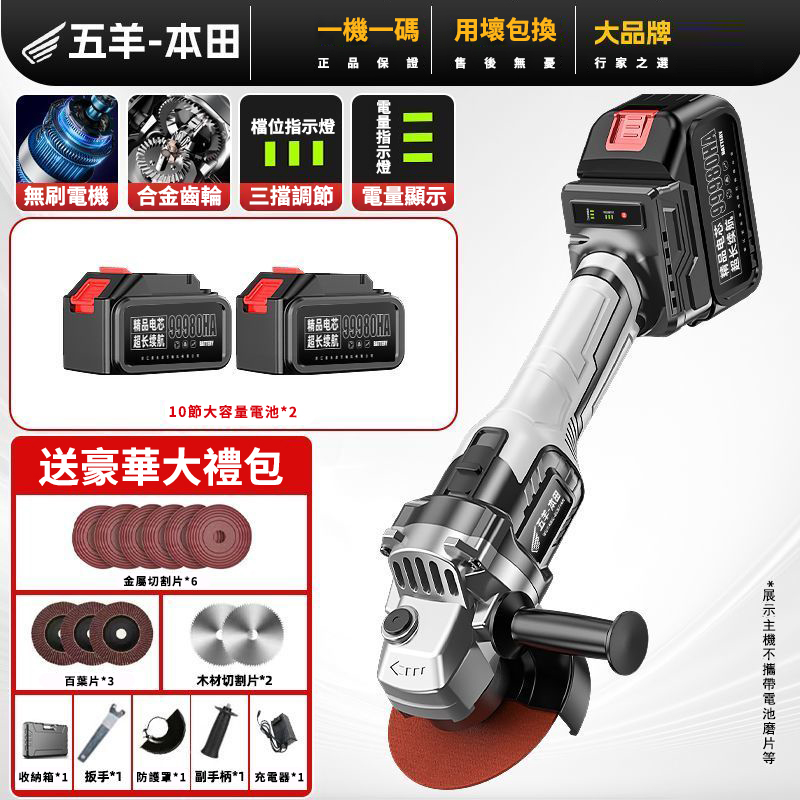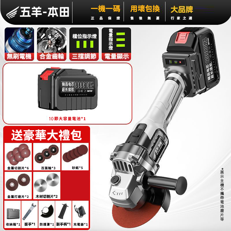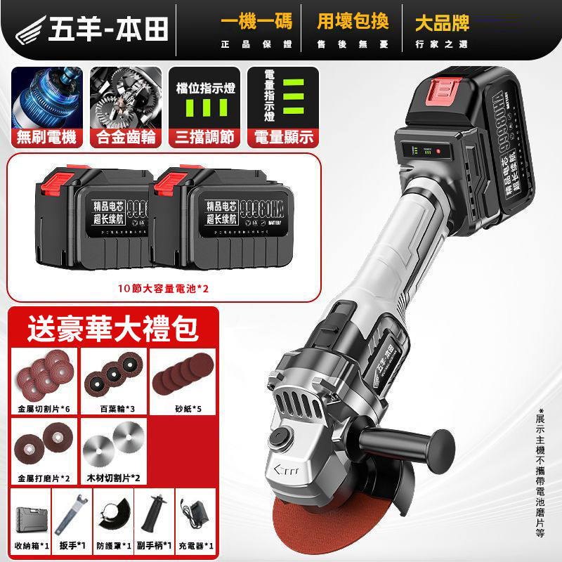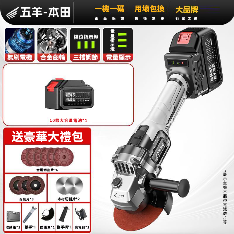 20分鐘前【日本-HONDA】升級帶電顯进口無刷鋰電角磨機 打磨 拋光 切割 一機多用 純銅電機 高效散熱 配置防護護罩 保護你的安全作業 保固三年 損壞包退換 限量出清 - 69800豪華電顯款【3電池】+塑盒