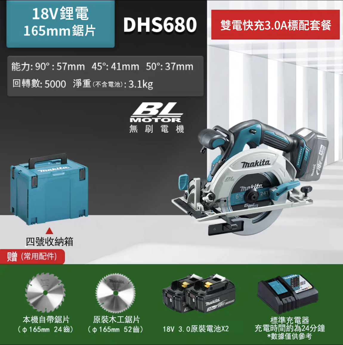 20分鐘前「牧田/Makita」DHS680 18V 4寸、7寸 多功能鋰電園鋸 大容量鋰電池 馬力強勁切割不卡殼 - DHS680【7寸】雙電3.0Ah電池+兩鋸片