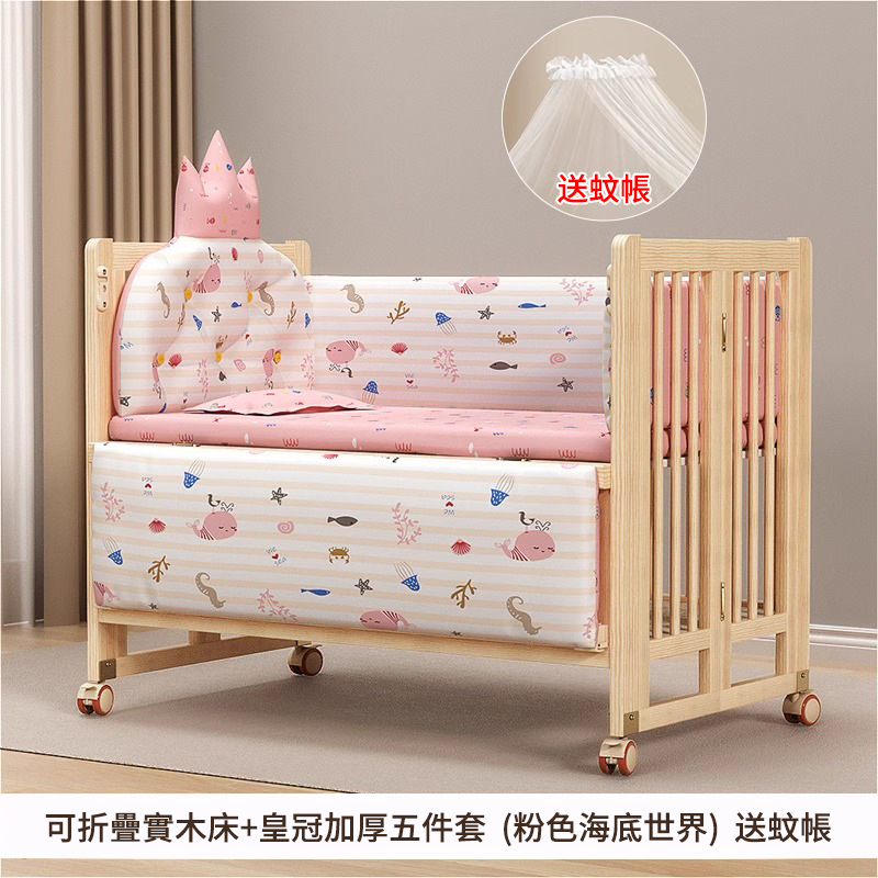 半小時前陪伴寶寶成長,永不閒置【嬰兒床-->遊戲床-->書桌】日本超火の可折疊嬰兒床,實木無漆更安心,可拼接大床+滑輪移動,多功能設計陪寶寶成長! - 【103*61*85cm】折疊小床+五件套+蚊帳