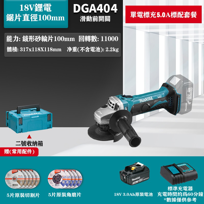 11分鐘前【Makita/牧田】DGA404 18V充電式砂輪機,變速!是同類產品中最安靜的角磨機之一 - 18V鋰電單電快充5.0Ah組